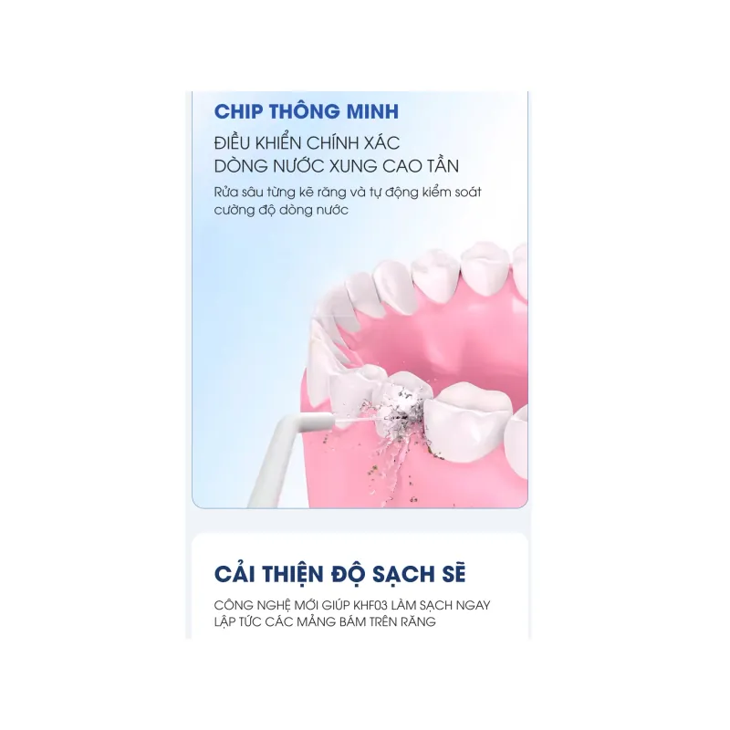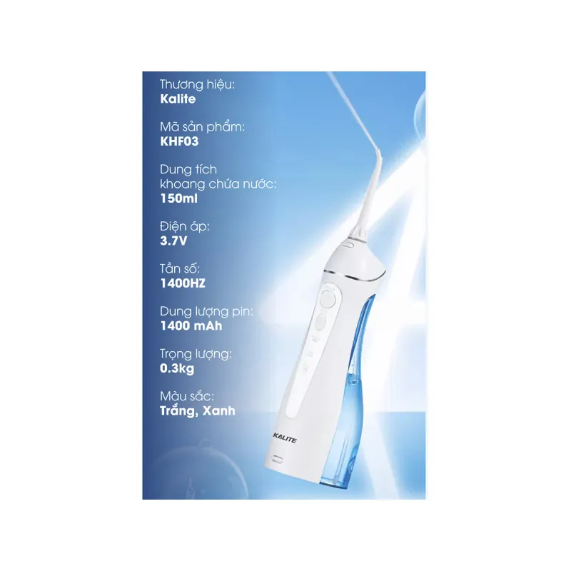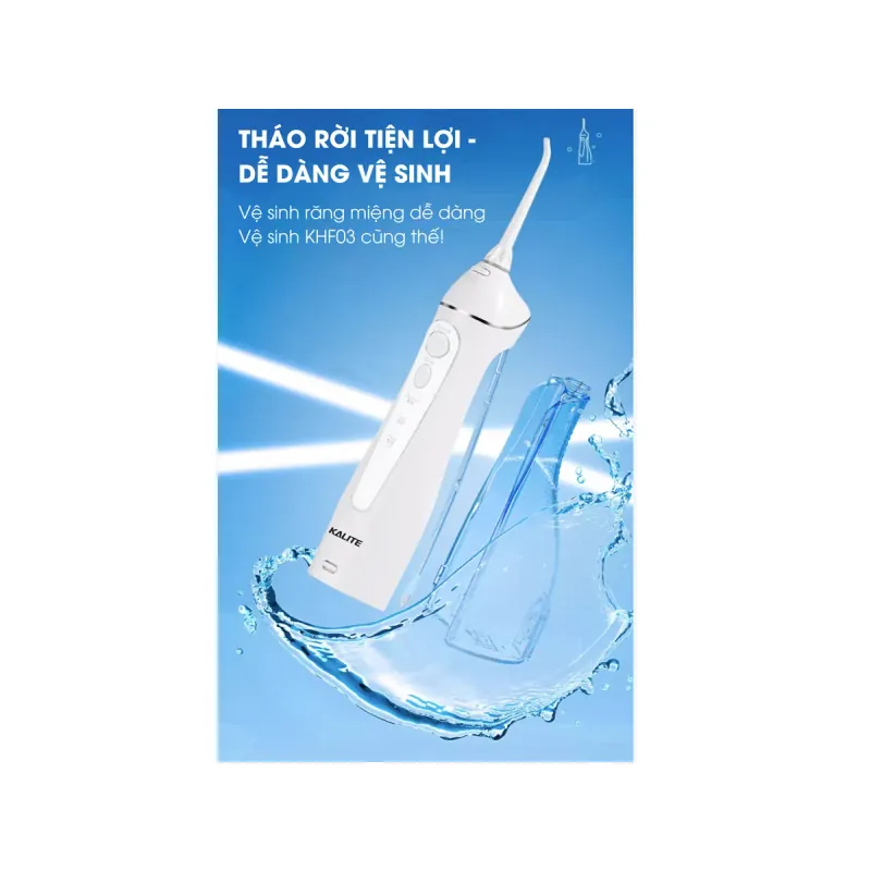 💧 Máy Tăm Nước Kalite KHF03 – Làm Sạch Sâu, Bảo Vệ Răng Miệng Toàn Diện Máy tăm nước Kalite KHF03 là giải pháp vệ sinh răng miệng thông minh, giúp loại bỏ mảng bám, thức ăn thừa tận sâu trong kẽ răng – nơi bàn chải và chỉ nha khoa khó tiếp cận. Với thiết kế nhỏ gọn, pin sạc tiện lợi, sản phẩm phù hợp cho cả gia đình và mang theo khi đi công tác, du lịch. 🔹 Đặc điểm nổi bật 🌊 Áp lực nước mạnh mẽ – Làm sạch đến 99% mảng bám, thức ăn thừa. 🦷 3 chế độ phun – Normal, Soft, Pulse phù hợp với mọi loại răng – nướu. 🔋 Pin sạc dung lượng lớn – Sử dụng liên tục 2 tuần chỉ với 1 lần sạc. 💡 Thiết kế chống nước IPX7 – An toàn khi dùng trong phòng tắm. 🌀 Bình chứa nước 300ml – Dung tích vừa đủ, d...Read more