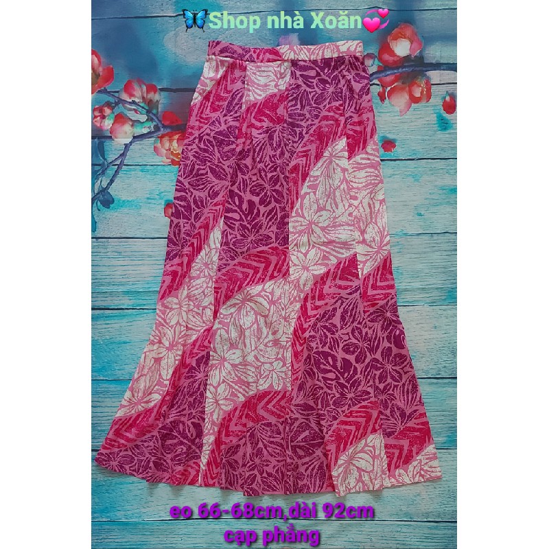 Chân váy xô hoa nhí hồng pha, dáng dài đuôi cá. Cạp phẳng eo 66-68, dài 92.