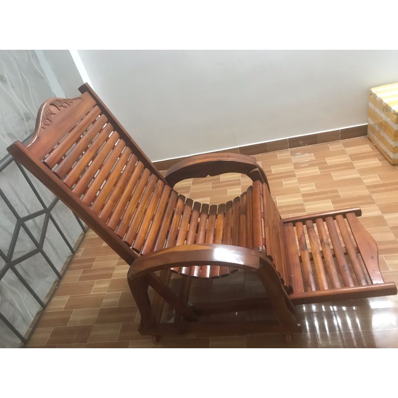 Ghế gỗ căm xe bóng đẹp như mới, có bánh xe dễ dàng di chuyển.