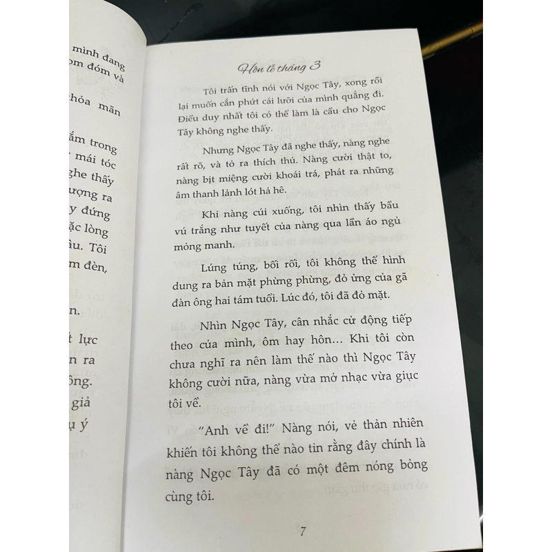 So với Nhặt Được Cô Vợ Nhỏ và Đánh Cắp Trái Tim thì Hôn Lễ Tháng Ba mang đến cho độc giả một câu chuyện nhẹ nhàng, một chuyện tình ngọt ngào giữa Ngọc Tây và Trần Hạ. Khi bình minh hé rạng, hãy hôn người tình bên cạnh, bởi vì nàng không hiểu những bộc bạch không lời. Dẫu biết rằng nên tìm cho mình một lý do để ra đi, hoặc là nên trở dậy tự phục vụ một cốc cà phê với dáng điệu tự nhiên, ít nhất cũng không để lộ vẻ mặt tự nguyện và đắm đuối, nhưng tôi lại chẳng thể làm gì hết, ngoài việc lún sâu hơn nữa vào lớp nệm mềm mại của ghế sofa, ngây người bởi mùi thơm thoảng ra từ phòng tắm, nhìn chăm chăm lên chùm đèn trần hoa cúc, nơi có một con đom đóm bị ánh sáng thu hút, đang bay loạn xạ.