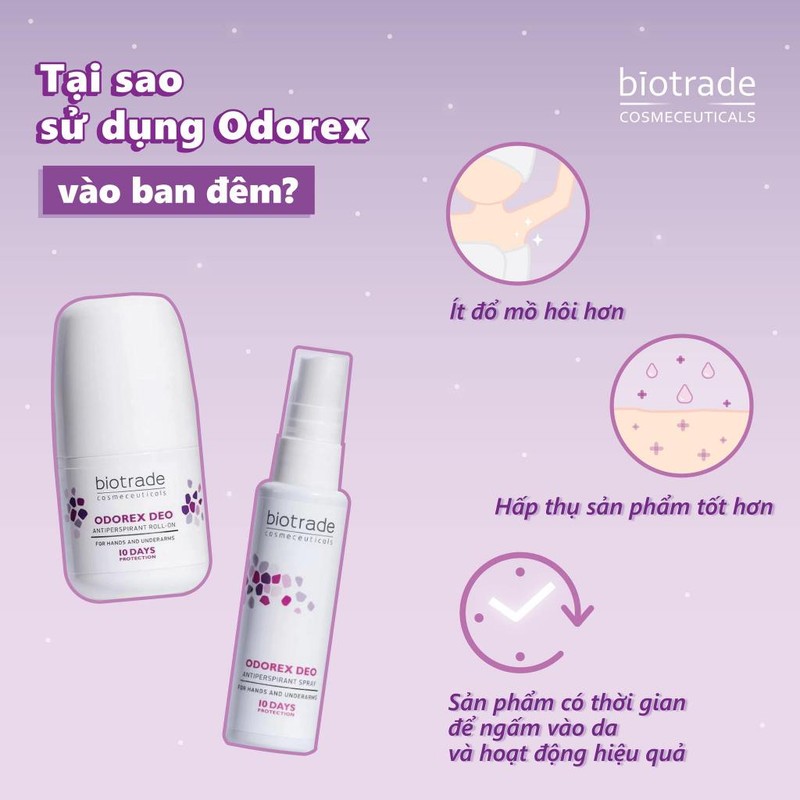 ODOREX DEO antiperspirant roll-on được thiết kế để chống lại mồ hôi quá nhiều và mùi khó chịu ở vùng dưới cánh tay và lòng bàn tay, giúp bảo vệ da lên đến 10 ngày chỉ với một lần thoa. BIOTRADE Xuất xứ: Bulgaria HSD: 36 tháng Cơ chế độc đáo của sản phẩm chỉ ảnh hưởng đến các tuyến mồ hôi hoạt động quá mức mà không ảnh hưởng đến quá trình điều nhiệt tổng thể. Bạn có thể kết hợp với nước hoa mà không cản trở tác dụng của nó. Sản phẩm hiệu quả và tiết kiệm. Không gây vàng áo và th-âm nách. CÔNG DỤNG - Chống lại mồ hôi quá nhiều và mùi khó chịu ở vùng dưới cánh tay và lòng bàn tay, giúp bảo vệ da lên đến 10 ngày chỉ với một lần thoa. THÀNH PHẦN SẢN PHẨM - Aluminium Chloride – ngăn tiết mồ ...Xem thêm
