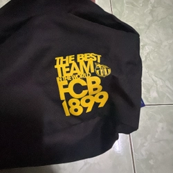 Chữ FC Barcelona và logo màu vàng, túi màu đen.